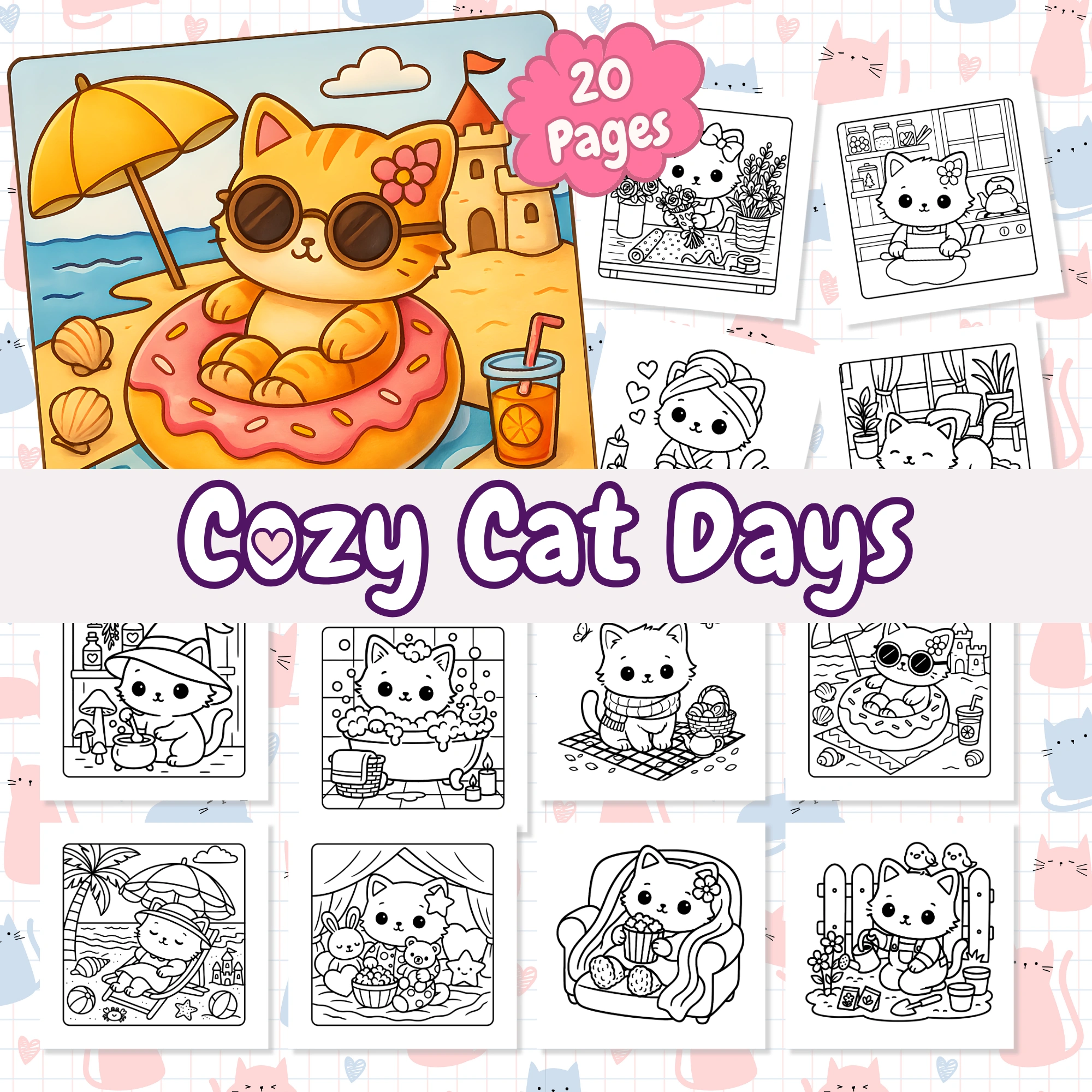 š± Cozy Cat Days Coloring Pages – 20 Adorable, & Pastoral Illustrations – Cute, Comfy & Peaceful Printable Instant Digital Download PDF for Kids and Adults